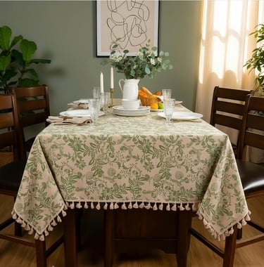 Emerald Green Farmhouse Tablecloth | 60" x 91" Premium Printed Cotton with Boho Tassels – Colorfast & Machine Washable – Elegant Decor for Weddings, Parties, & Daily Dining.