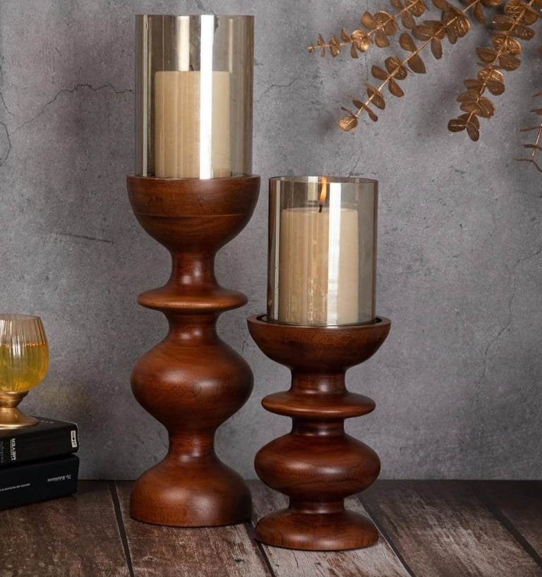 "Turn your dining table from 'everyday' to 'extraordinary.' This Set of 2 Mango Wood stands creates an instant focal point with their unique wavy design and protected glass flame.